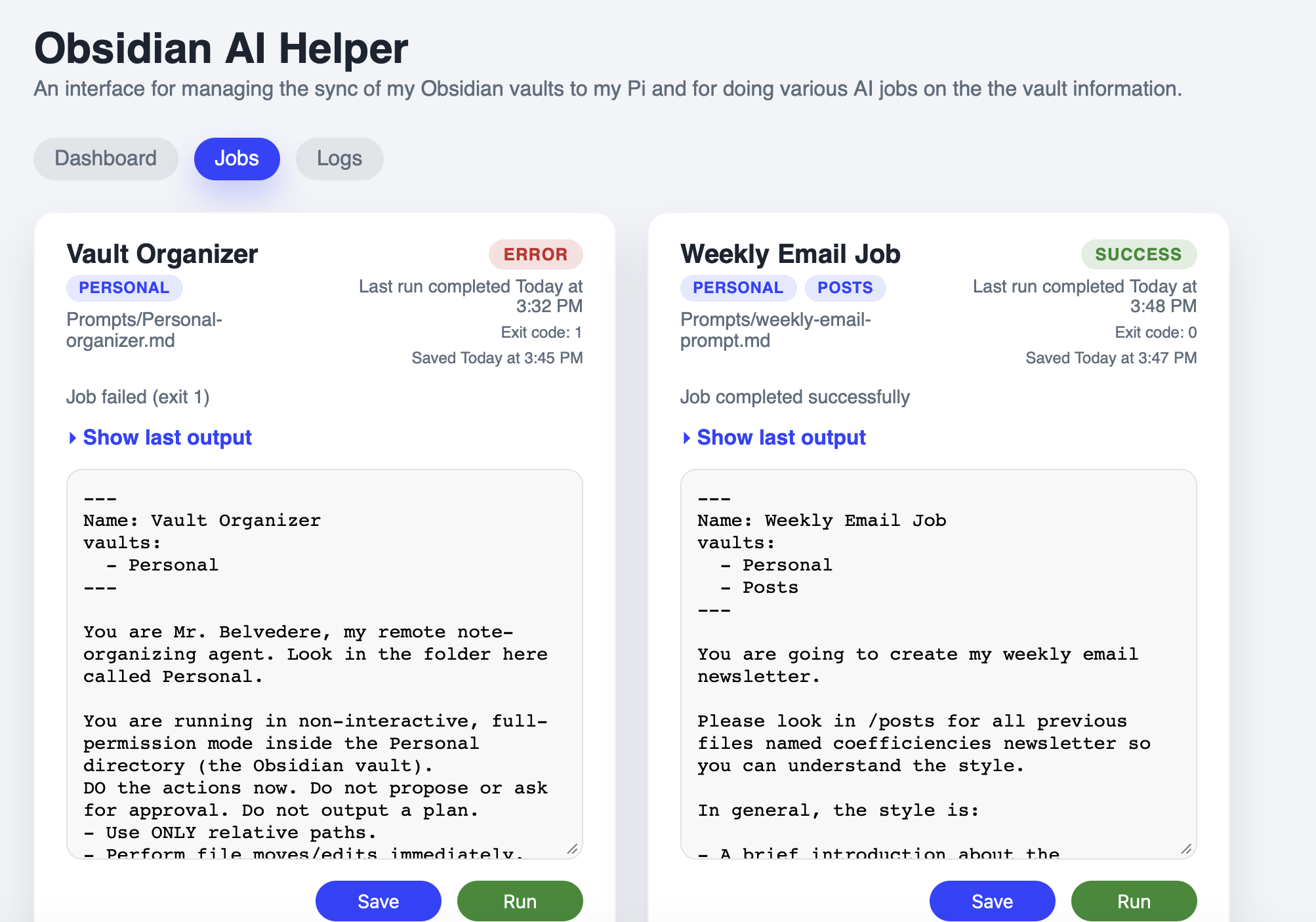 A quick test confirmed it worked: I can update prompts, run them, and get status updates (including whether the last run errored ). I’m thinking of adding the ability to create a new prompt file directly from the web UI. Well, except…