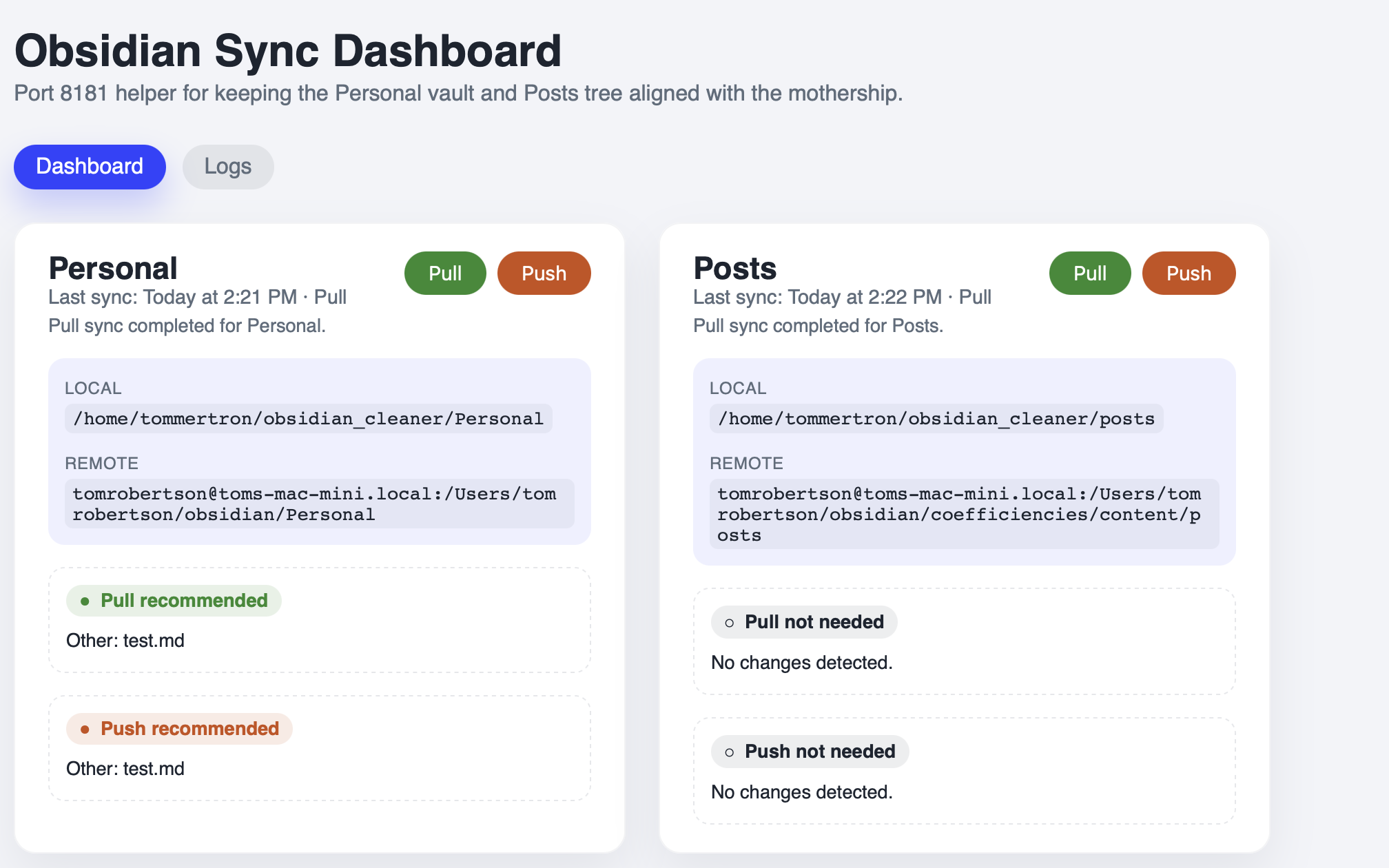 I decided I needed a small web interface to manage all of this: pull changes from the Mac Mini, kick off the Codex jobs I wanted, and push changes back. That way I could review changes before pushing and avoid damaging my primary Obsidian vault. One problem: I ’m not a web developer. So I tried “vibe coding” for real and had Codex build the web interface.